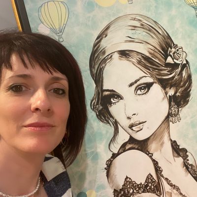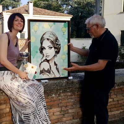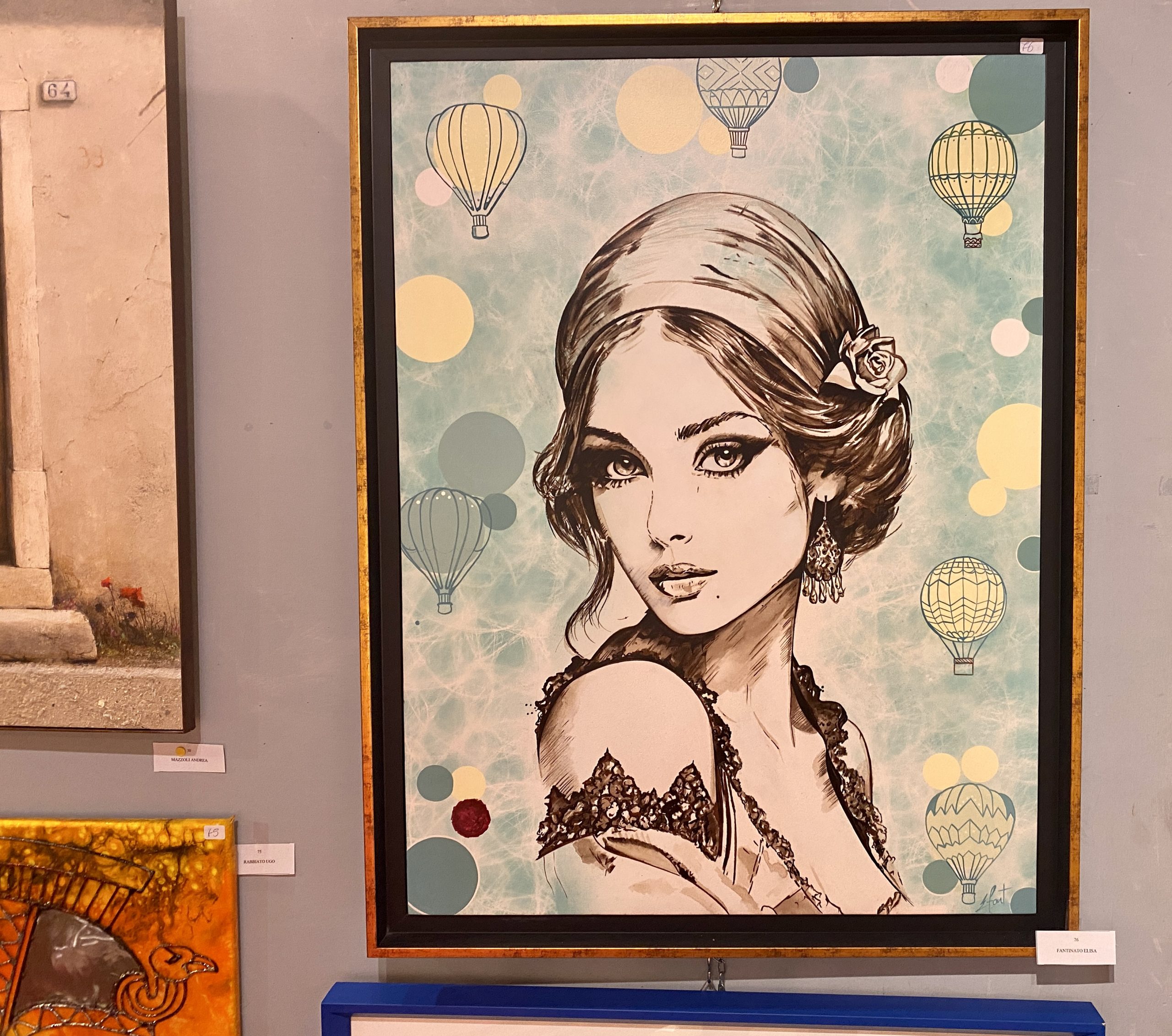 Il mio dipinto rappresenta una donna in primo piano avvolta da mongolfiere che viaggiano nel fondo. La mongolfiera solitamente è simbolo non solo di viaggio ma anche di scoperta. Esplorare, con un altro punto di vista, dall’alto, un territorio e una zona. Le zone del Polesine sono senza tempo, come la mia donna dipinta, con stile retrò, quasi per allontanarsi dal mondo contemporaneo e dalla società moderna. Un luogo di pace, libertà e poesia. Praticamente le medesime emozioni che provi in mongolfiera, quando ti stacchi dal suolo e quasi quasi dalla realtà in cui vivi.