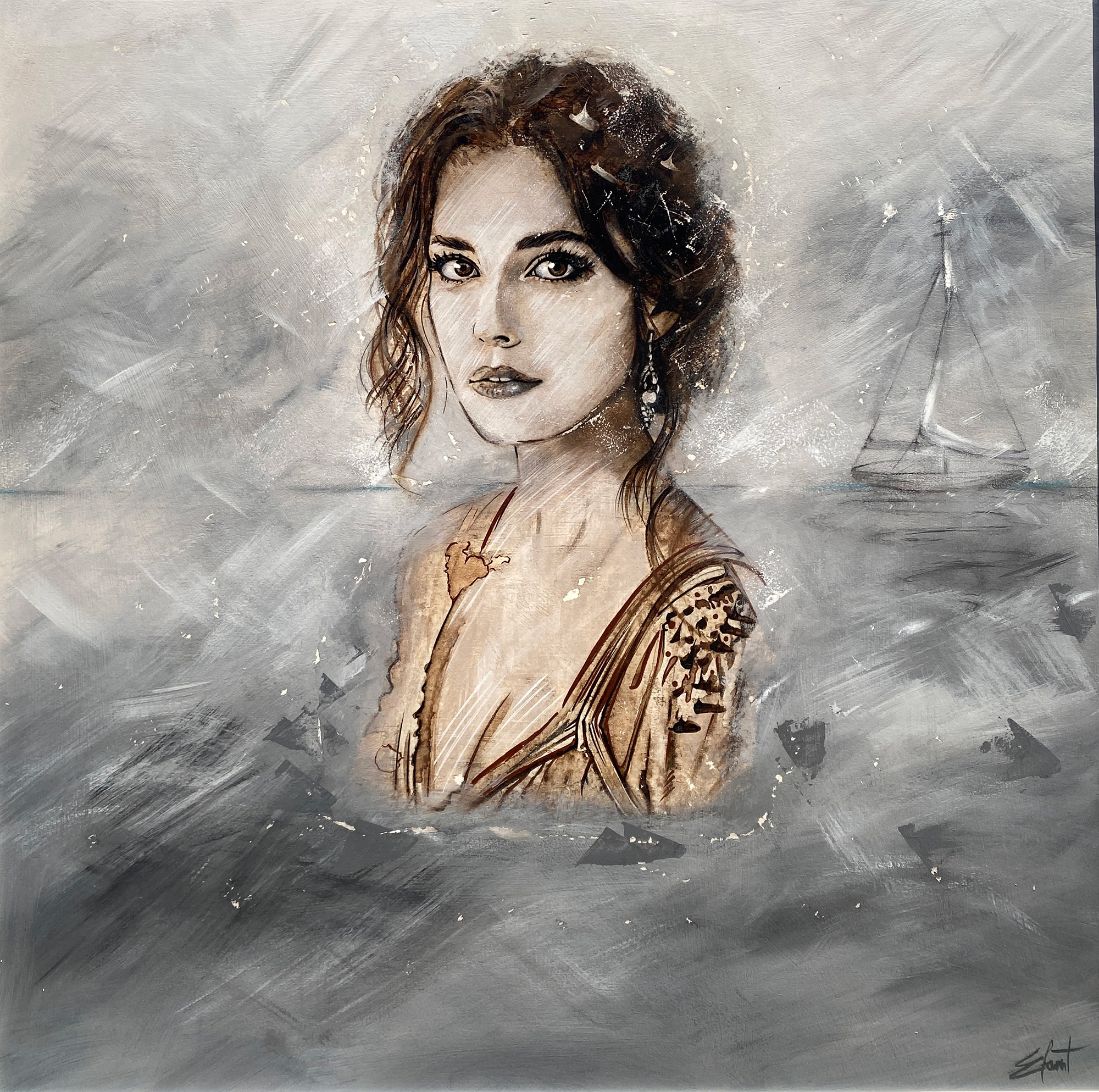 Al largo, nel mare in burrasca, una donna emerge come segno di forza e coraggio.